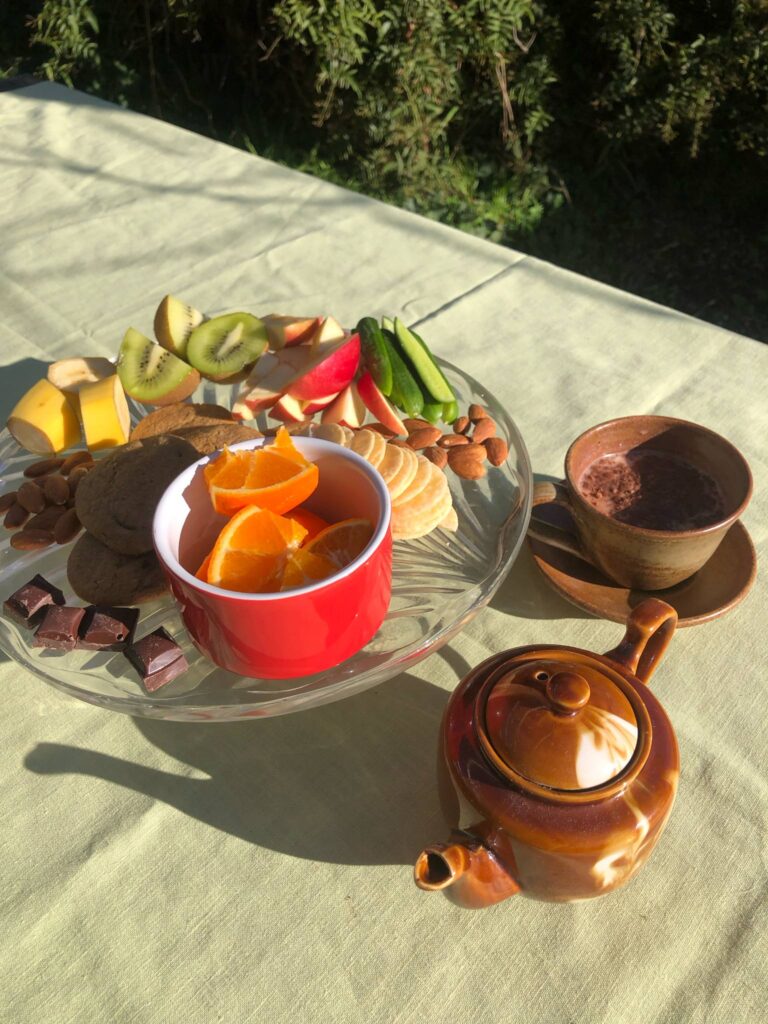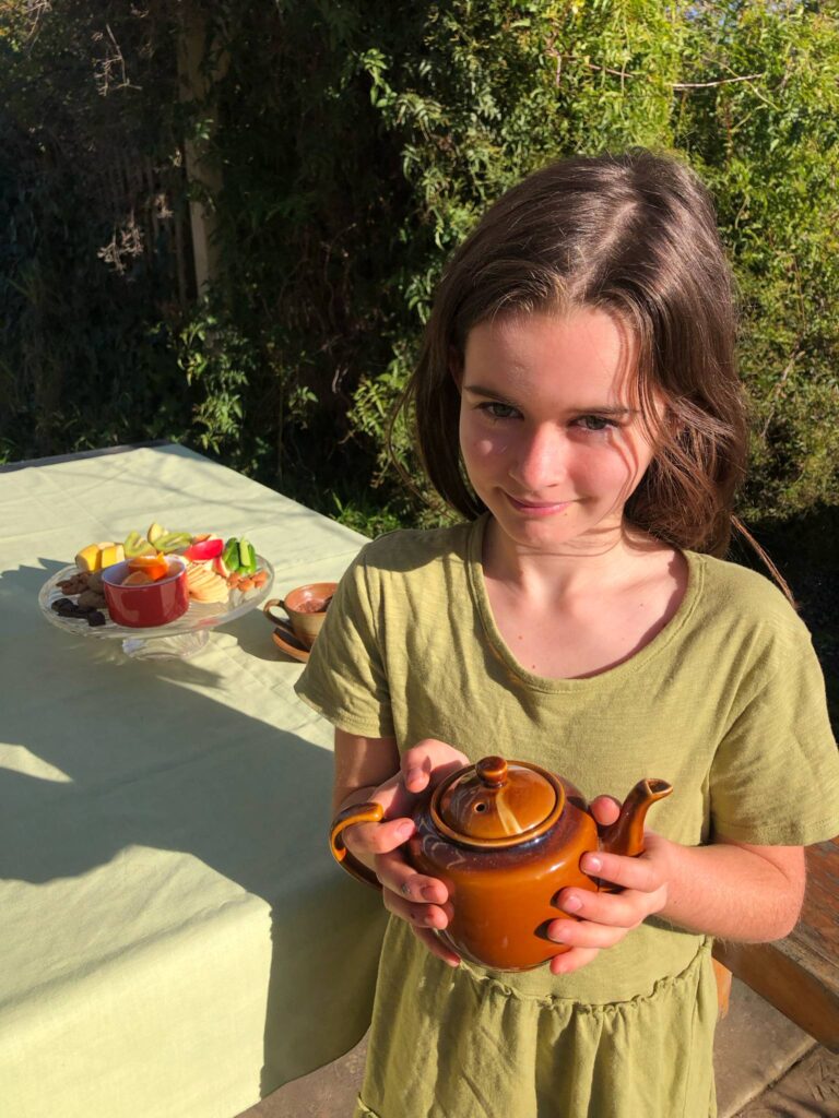 We use the same glass pedestal platter that I found at the op-shop each High Tea and I pile on seasonal fruit and vegetable sticks, whatever we have baked lately, nuts and perhaps some dip. The children like to arrange the food into patterns when they help with preparations. It’s funny how I can serve the same food I would have put onto their little plastic plates anyway but it feels more special on a pedestal dish. Your children may be more cultured than mine and be happy with herbal tea in the teapot, we have tried a variety of flavours but have settled on Milo for our warm drink. I like to have the drink warm rather than hot as the children enjoy pouring from the teapot themselves.