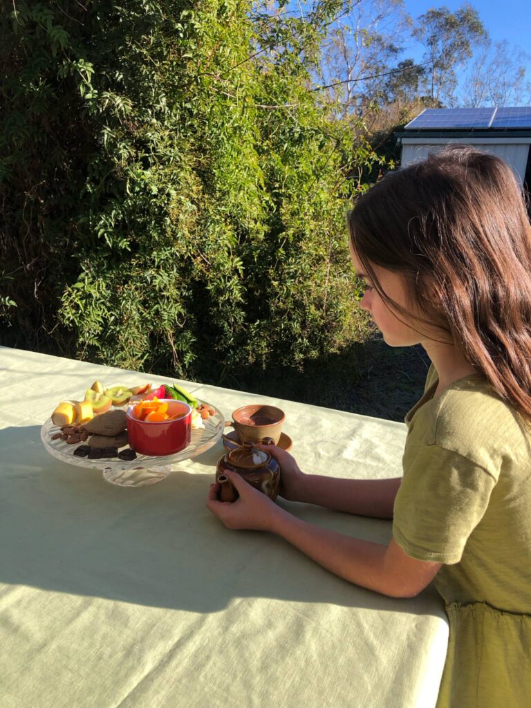 Poetry High Tea is a sweet time when the kids and I set up a little tea party and share poetry with one another. This concept was one of the many that I gleaned from the beautiful and inspiring book ‘The Call of The Wild and Free’ by Ainsley Arment. We began weekly poetry high tea on Friday mid morning when I was homeschooling my young children. This quickly became a highlight of the week. I am not homeschooling anymore but every school holidays one of the kids will invariably ask if we can have poetry high tea. Here is what it looks like at our house.