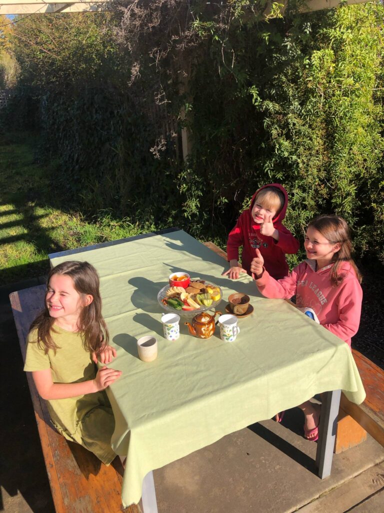 We use a tablecloth for Poetry High Tea. This separates it from our normal meals and snacks as we don’t usually use a tablecloth. If we are having Poetry High Tea inside we will light a couple of candles. If we are sitting out in the sunshine we skip that step. Each child has a little mug or teacup, an op-shop one would be perfect because then there’s no stress if there’s a broken cup by the end.